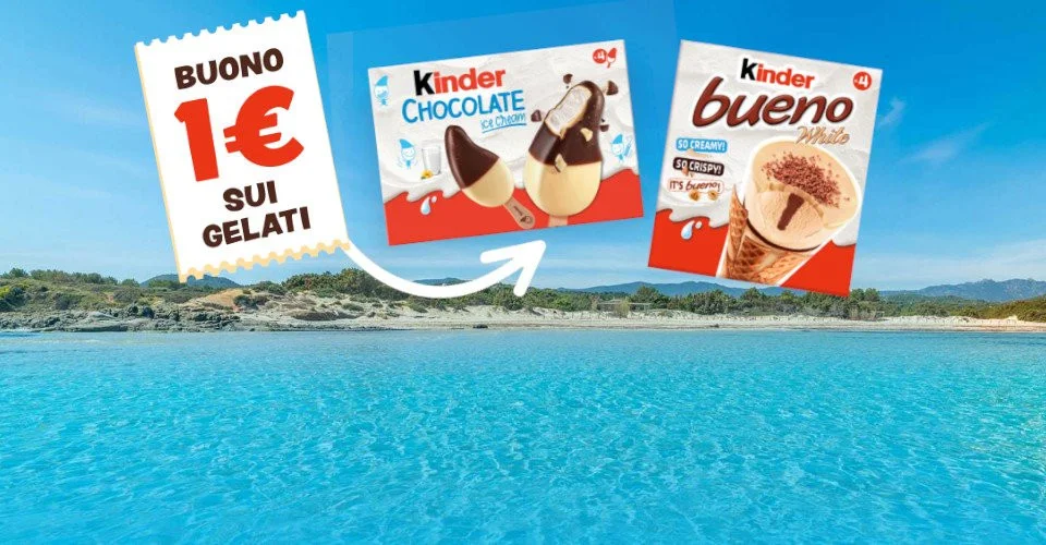 Ricevi subito il buono sconto Kinder Gelati da 1β¬ (garantito per tutti). Sei iscritto automaticamente all'estrazione del viaggio in Sardegna da 14.000β¬ (4 persone, 7 notti).