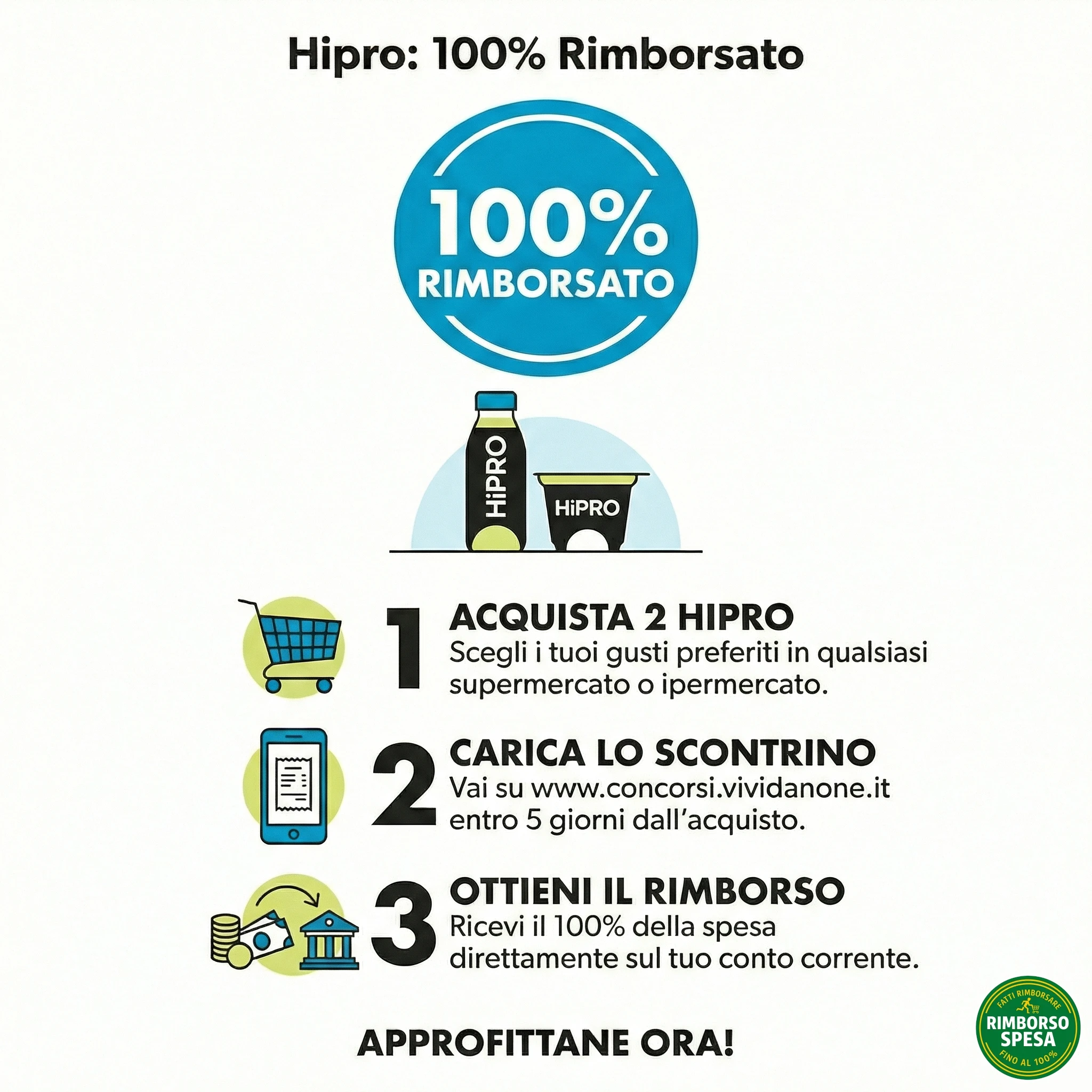 Compra almeno 2 prodotti HIPRO a tua scelta in supermercati, ipermercati, discount o relativi e-commerce (es. Esselunga online, Conad online). Paga con contanti, bancomat o carta.
