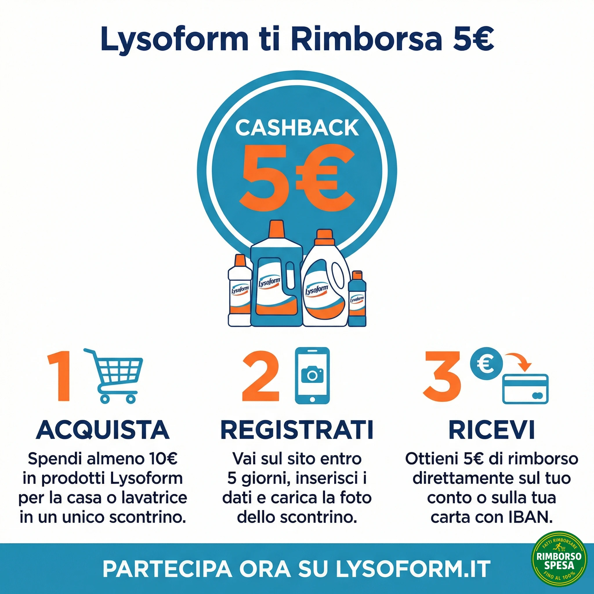 Compra almeno 10 euro di prodotti Lysoform per lavatrice o detergenza casa, a tua scelta tra spray, pavimenti, sgrassatori e additivi. Acquista nei negozi aderenti che espongono il materiale promozionale oppure su Amazon.it (solo venditori italiani con ricevuta italiana). Serve uno scontrino unico e parlante che mostri i prodotti.