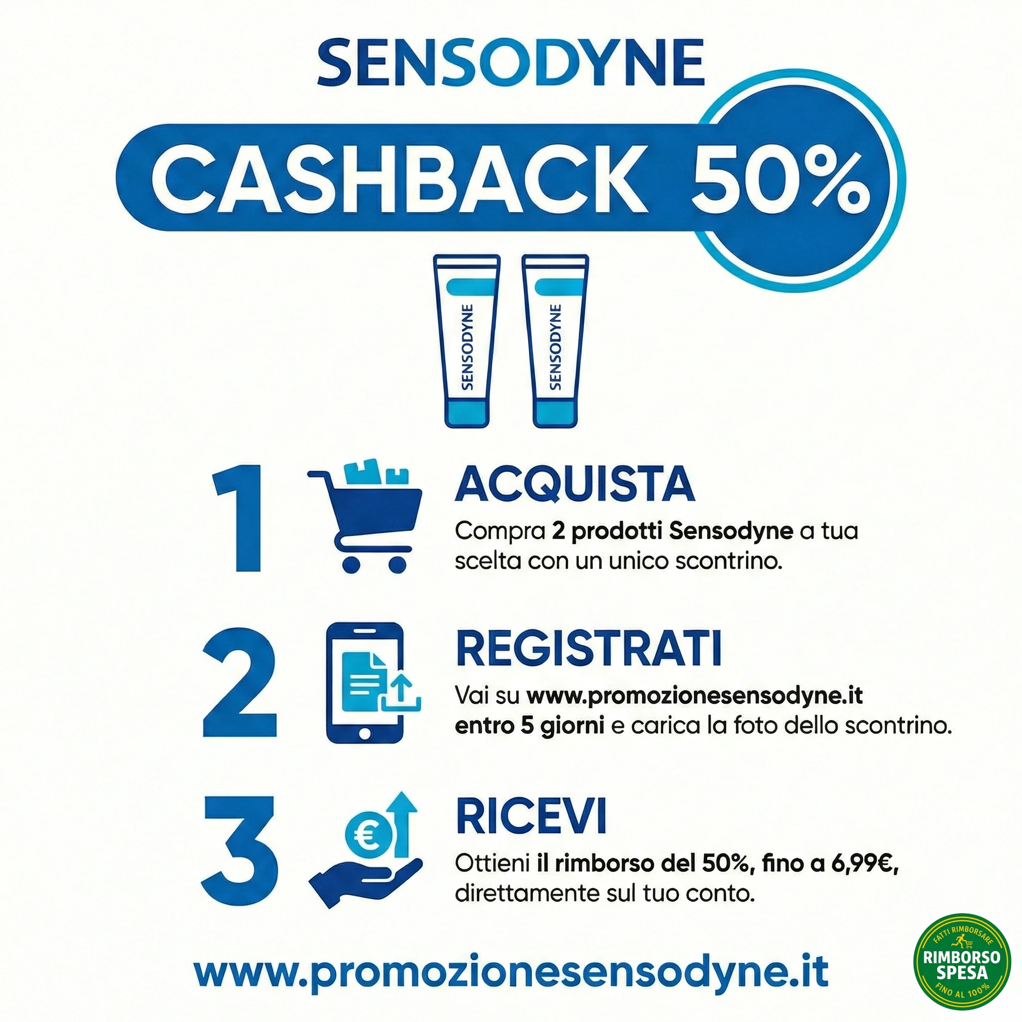 Massimo 1 rimborso per persona per tutta la durata della promo. Ogni email e ogni IBAN possono ricevere 1 solo rimborso. Solo scontrini cartacei (no digitali). I bi-pacco contano come 1 prodotto. Non usare lo stesso scontrino per altre promo Sensodyne.