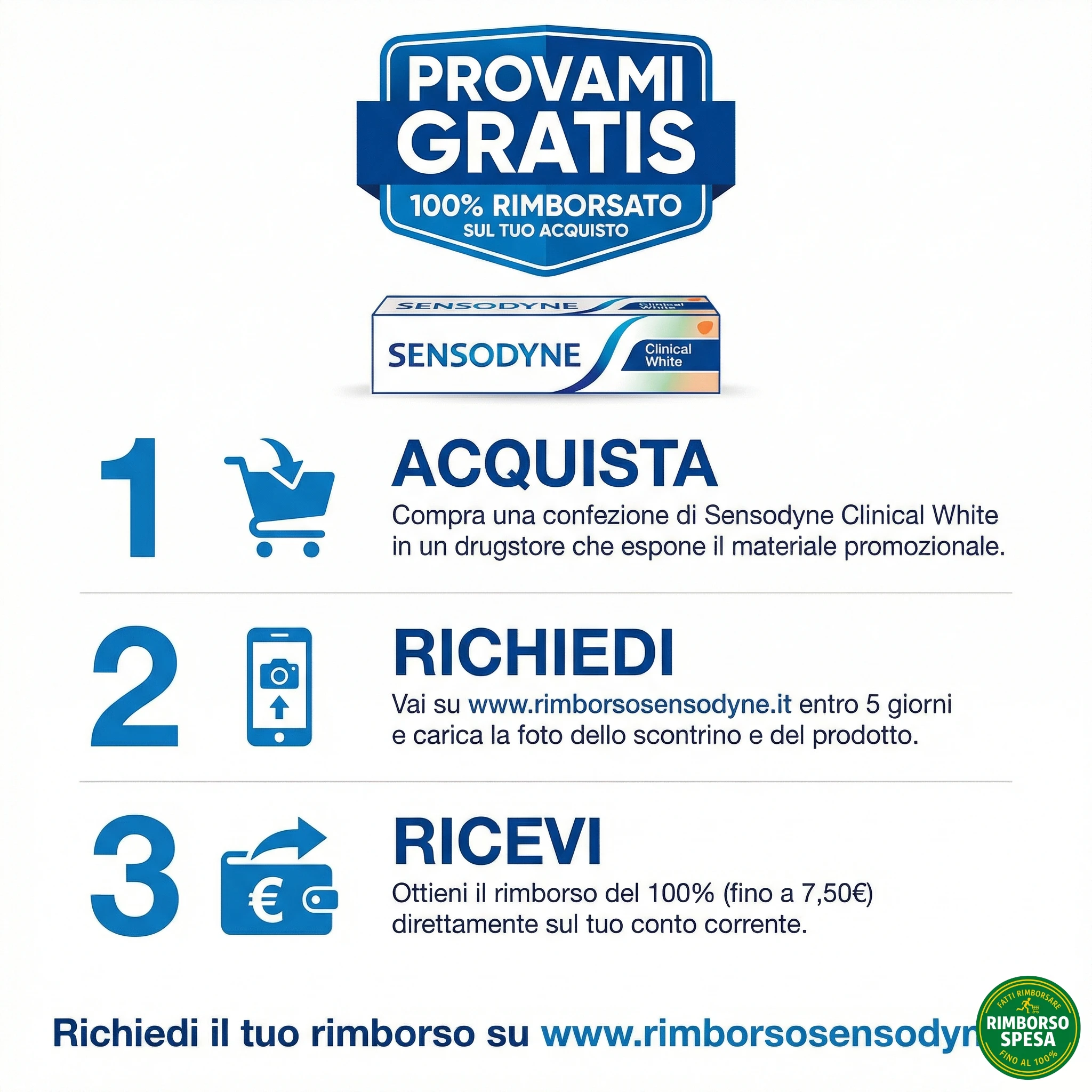 Collegati al sito ufficiale entro 5 giorni dall'acquisto, registrati e carica la foto leggibile dello scontrino cartaceo parlante (deve indicare chiaramente SENSODYNE CLINICAL WHITE, non generico) e la foto del prodotto acquistato. Inserisci il tuo IBAN di cui sei intestatario o cointestatario (no libretti postali, solo conti UE).