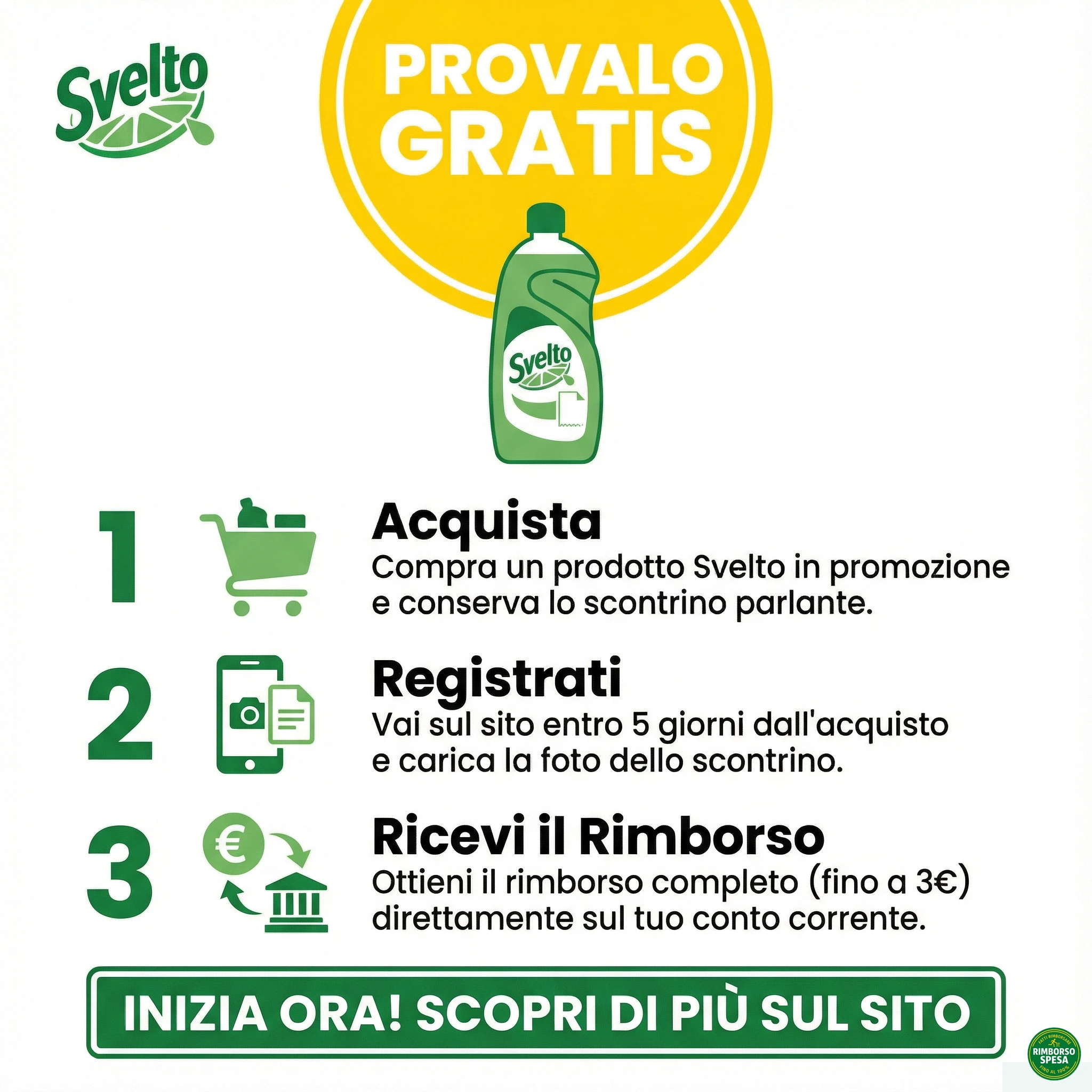 Accedi a sito ufficiale entro 5 giorni dall'acquisto. Registrati con dati personali, inserisci numero documento scontrino (8 cifre), carica foto integrale dello scontrino (mostrando insegna, data, ora, importo, numero documento, prodotti). Scegli rimborso: bonifico IBAN o carta ricaricabile IBAN. Conferma email entro 24 ore.