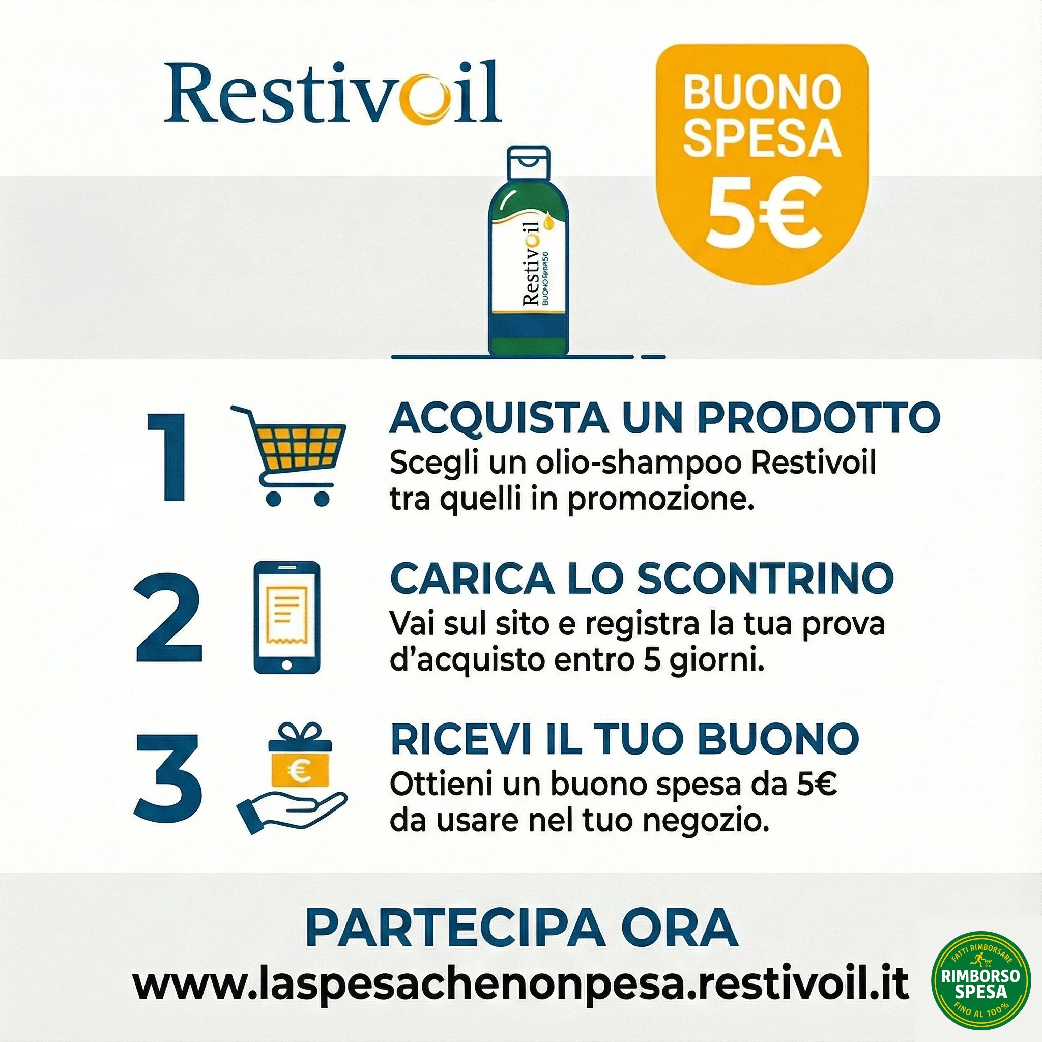 Compra almeno 1 prodotto Restivoil (olio-shampoo 150ml) presso Acqua&Sapone, TigotΓ , Coop, Conad, Carrefour, Bennet e altri supermercati aderenti. Solo punti vendita fisici, esclusi acquisti online.