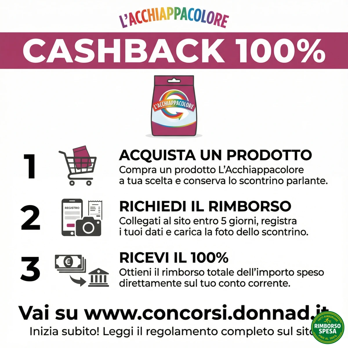 Compra 1 prodotto L'Acchiappacolore a tua scelta in un punto vendita aderente (con materiale promo esposto) o e-commerce afferente. Conserva lo scontrino parlante.