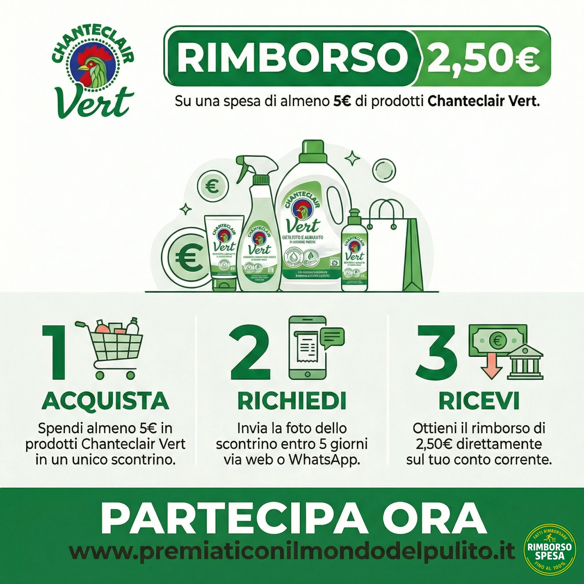 Spendi almeno 5 euro in prodotti Chanteclair Vert (detersivi lavatrice, piatti, ammorbidenti) con un unico scontrino parlante nei negozi aderenti che espongono il materiale promozionale. ESCLUSIONI: Amazon, eBay, Privalia, Groupon. PDV confermati dagli utenti: Bennet e Acqua & Sapone (dal 9 gennaio).