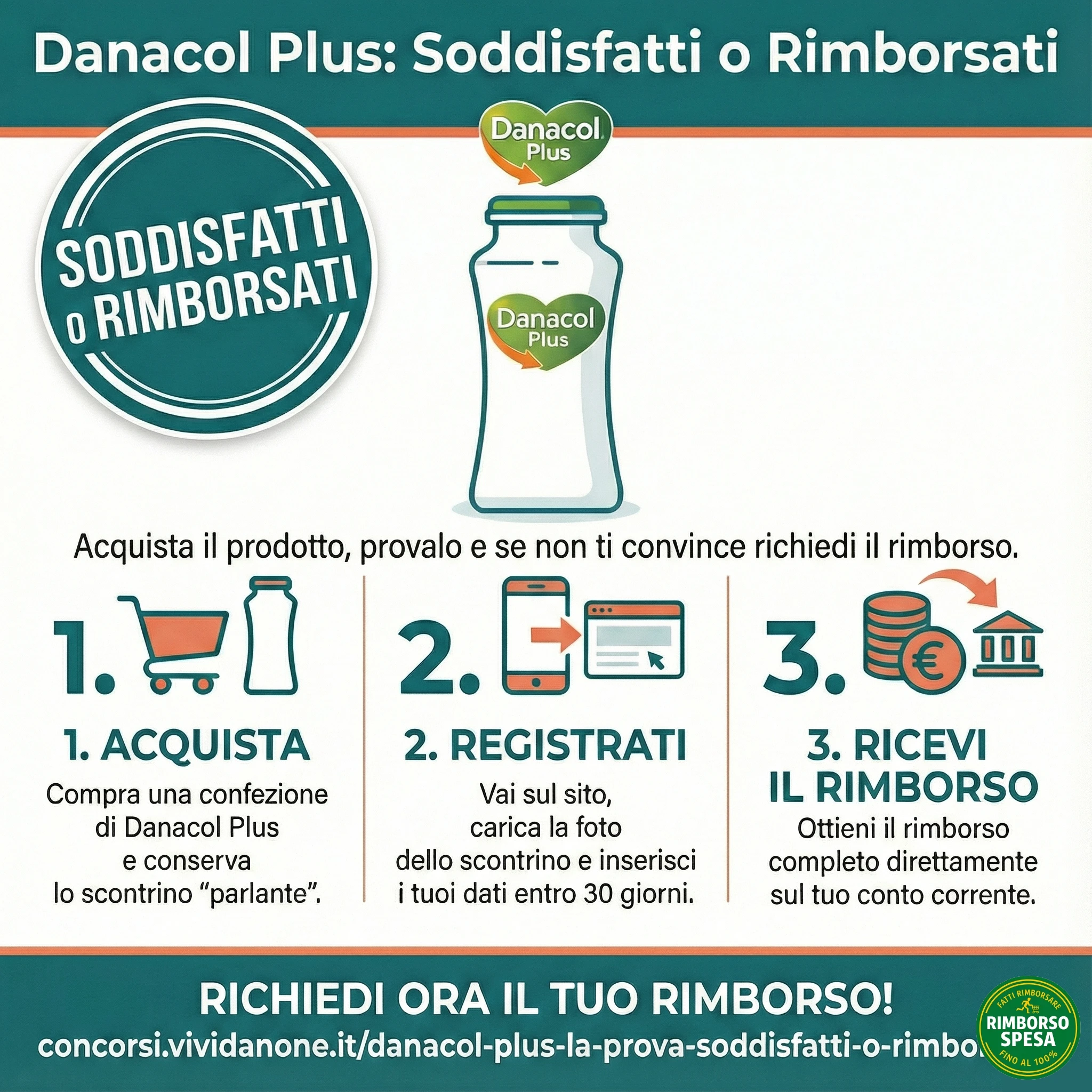 Prova il prodotto. Se non sei soddisfatto entro 30 giorni dall'acquisto, vai sul sito ufficiale e carica lo scontrino parlante (deve mostrare Danacol Plus o EAN 8001630011192). Compila il form di gradimento.