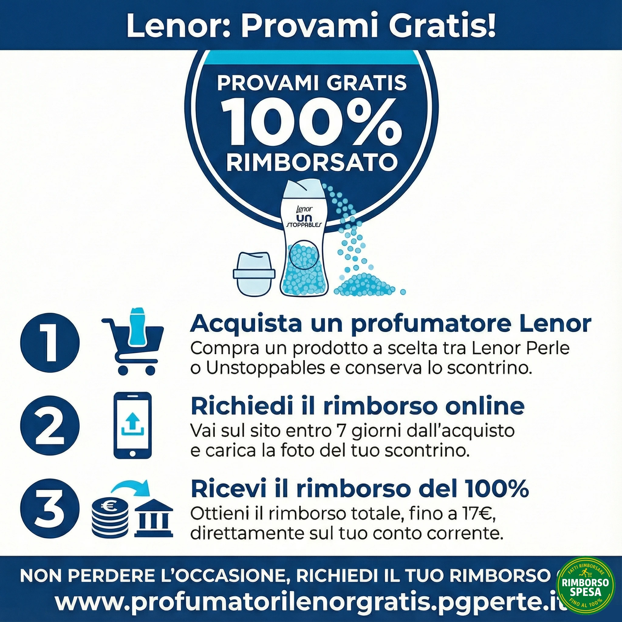 Compra 1 profumatore Lenor (Perle o Unstoppables) in qualsiasi supermercato o e-commerce italiano. ESCLUSI: Amazon, eBay, Privalia, siti esteri. NO ammorbidenti.