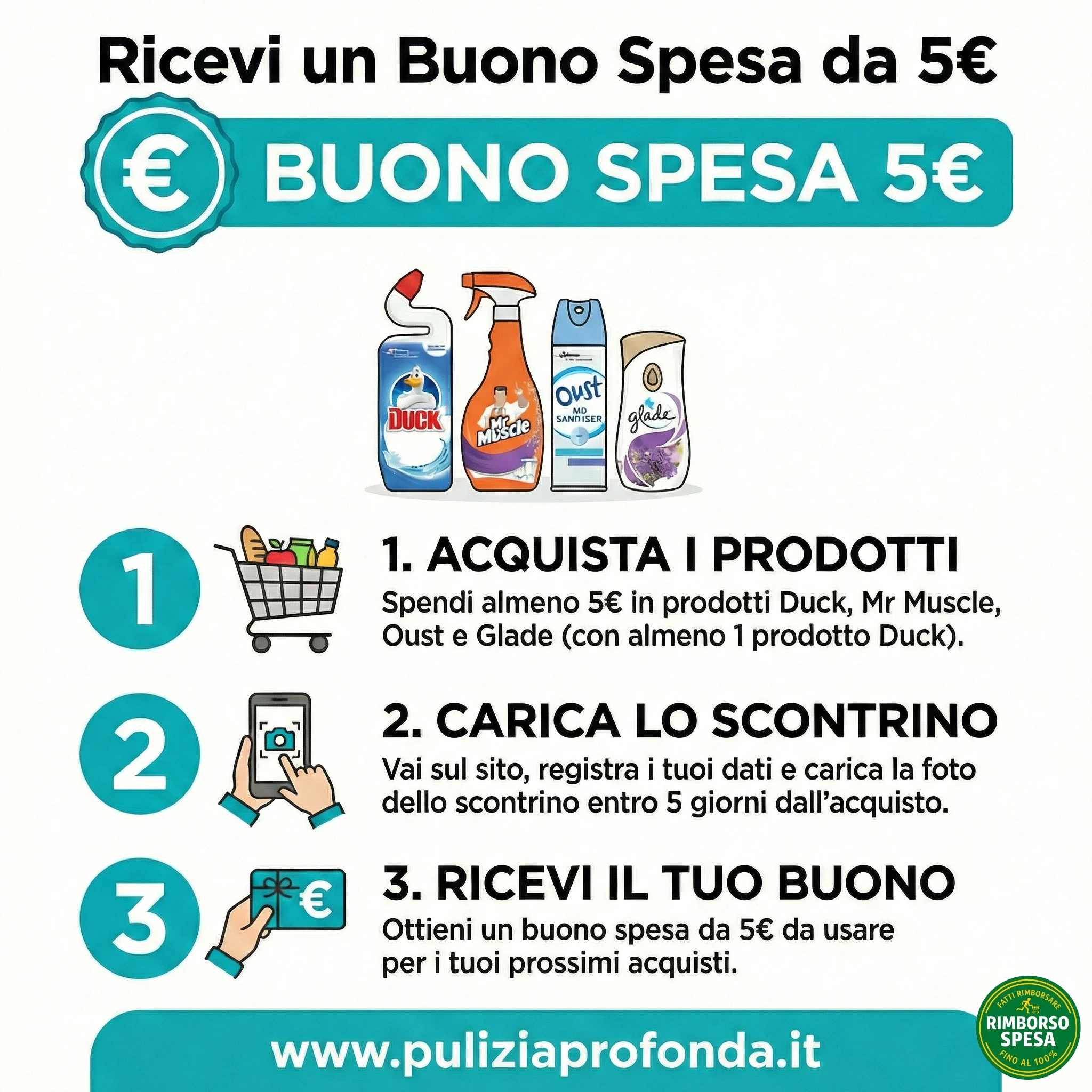 Ricevi un buono sconto da 5 euro valido per acquisto di prodotti Duck, Mr Muscle, Oust e Glade presso i punti vendita aderenti. Erogazione entro 180 giorni dalla fine della promo. Combo smart: Duck Fresh Discs + Glade Spray = circa 5 euro, praticamente GRATIS col buono!