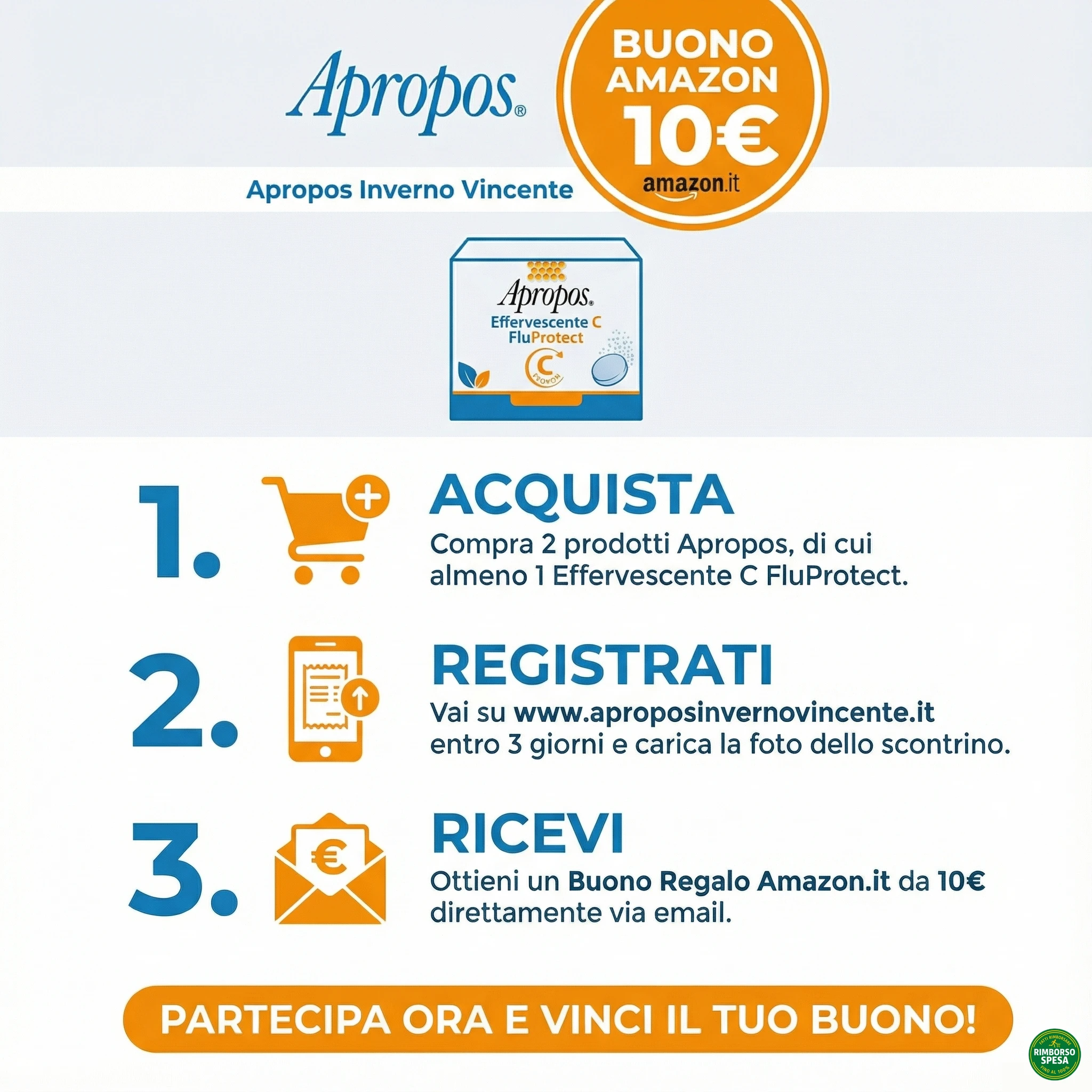Acquista almeno 2 prodotti Apropos (di cui 1 Effervescente C FluProtect obbligatorio) in farmacie, parafarmacie o corner GDO in Italia. Scontrino parlante con nome e marca prodotti visibili. Esclusi acquisti online e formati bipacco/multipacco.